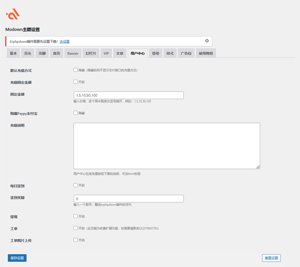 本款主题若要正常使用,需要安装配套插件erphpdown,购买主题将会赠送此款插件,版本号是11.7,插件已经集成支付宝、微信支付、Paypal支付、网银支付等原生接口,以及其它第三方个人免签支付接口,可以设置多种VIP会员方式,包含体验VIP、包月VIP、包年VIP、终身VIP权限等,用户可升级成为VIP(包月、包年等),管理员发布资源时可选择VIP免费或折扣,等等。