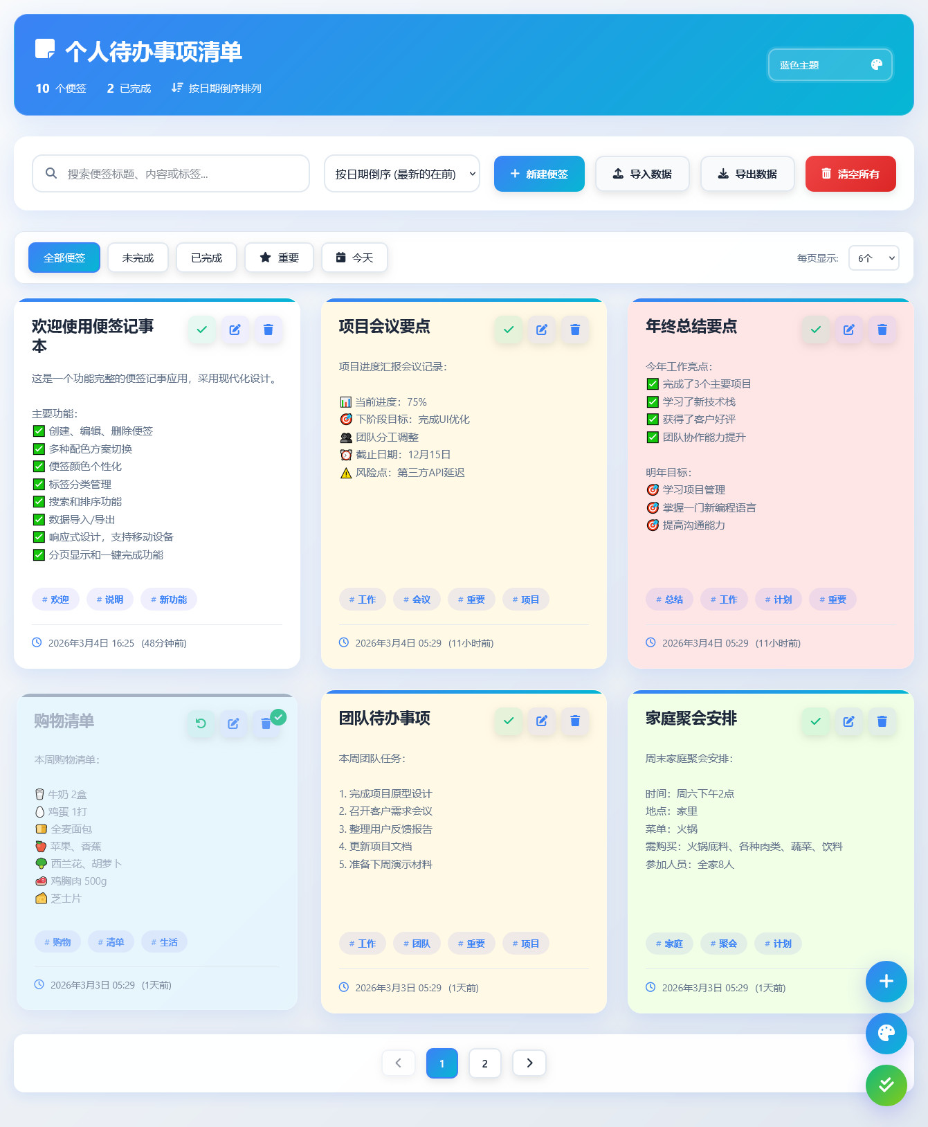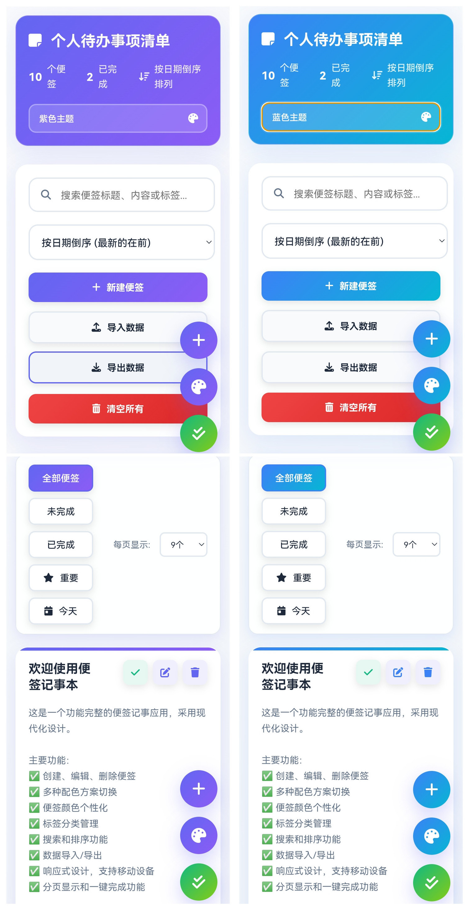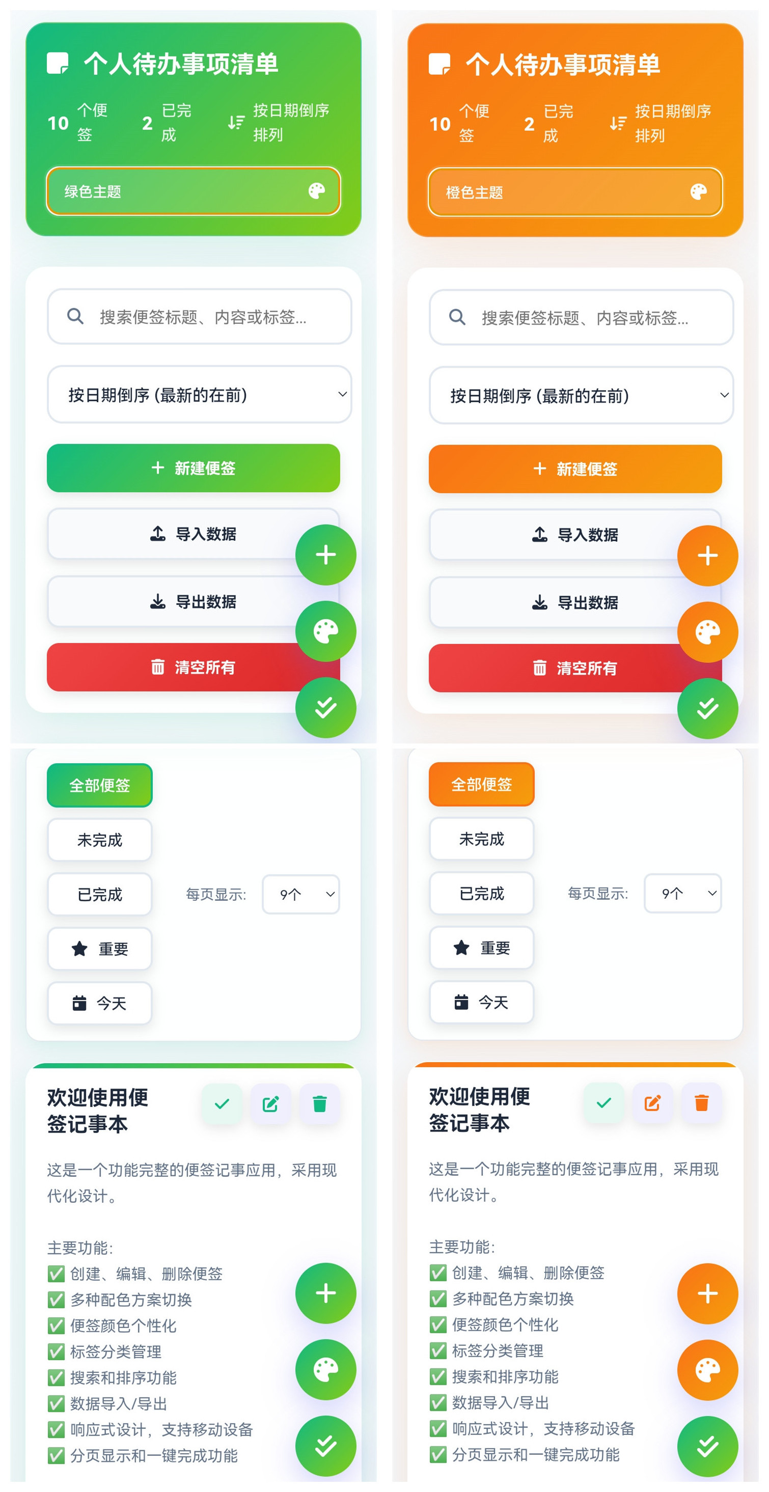 本款安卓APP非常实用,内置15种主题配色(8种主流色+7种混合色),支持本地导入导出便笺数据(json格式),支持一键切换主题配色,支持一键完成便笺功能,支持一键清空便笺内容,支持多种便笺排序方式,支持搜索便签标题、内容和标签(即写即搜),支持便签背景色个性化,等等。
