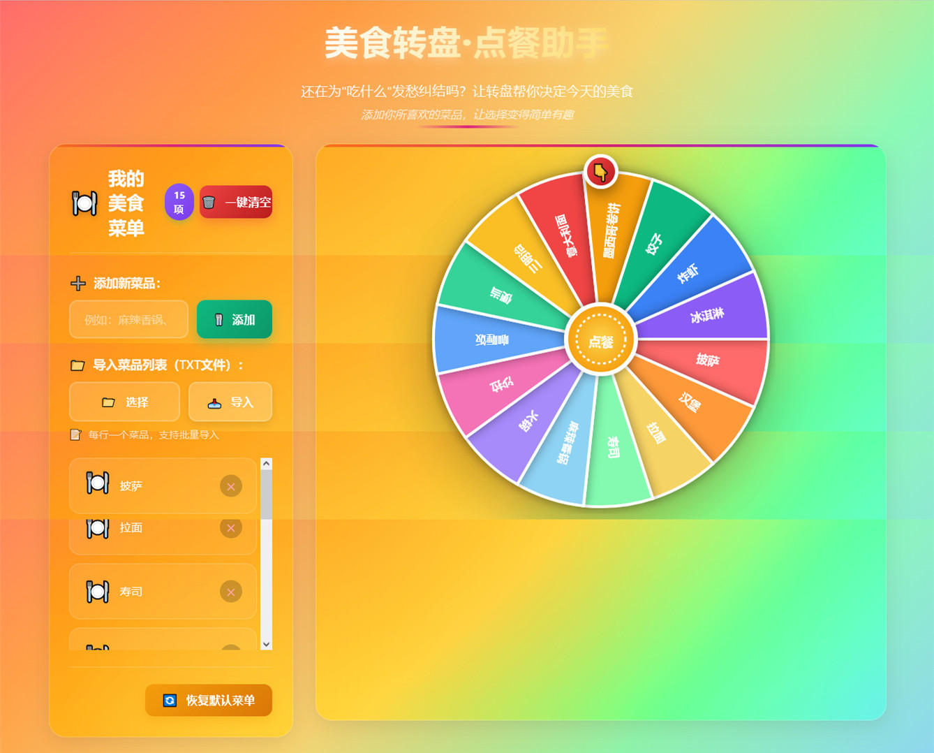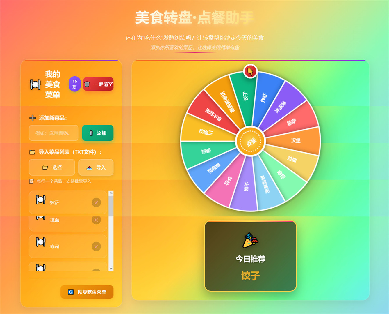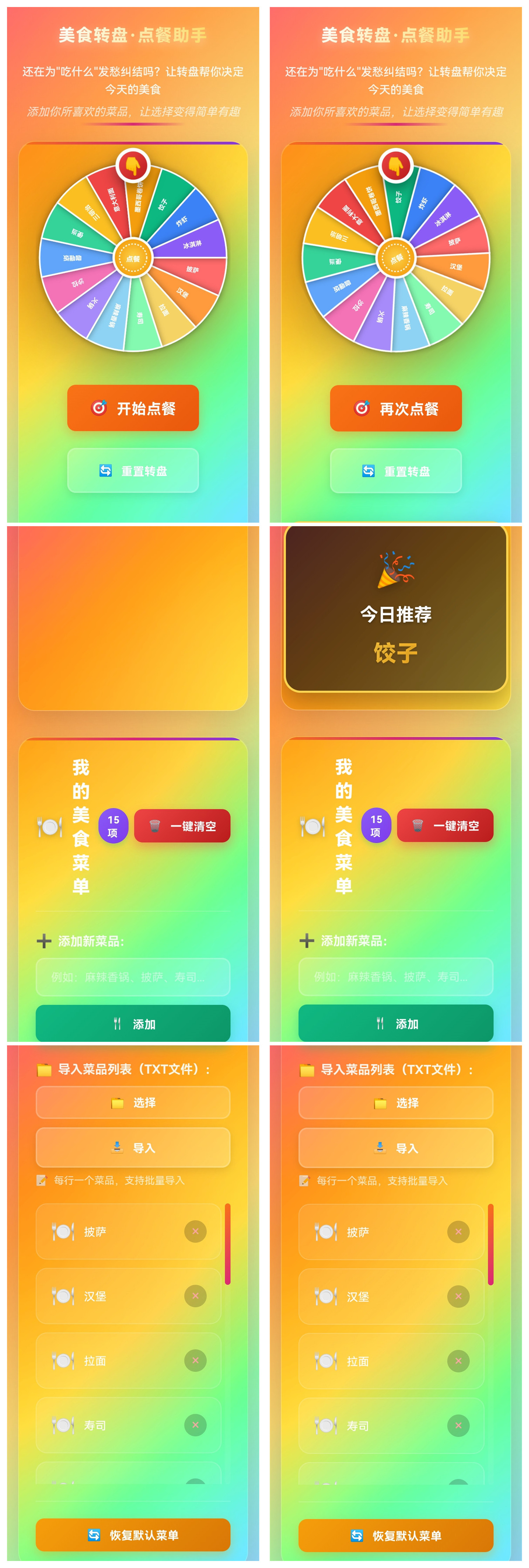 这是一款安卓APP应用(美食转盘),专为有选择困难症的朋友设计,可以通过自定义菜品列表,采用转盘随机点餐方式,快速决定自己每餐吃什么,也许概率才是最懂你的。本款APP简单实用且界面精美,支持预设菜单选项,支持手工添加单个菜品,支持批量导入菜品(TXT文件),支持一键清空所有菜品,支持一键恢复默认菜单,等等,可以为你的生活增添一点乐趣。